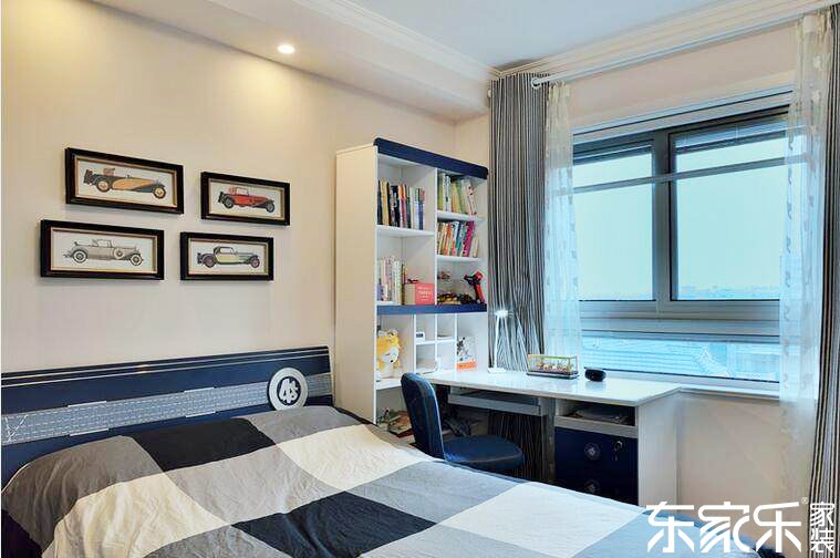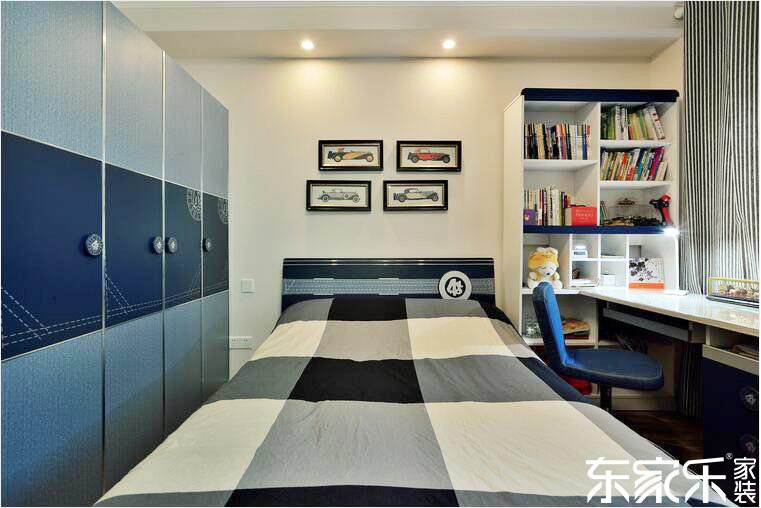 次臥室以藍色和白色為主色調,白色的墻面和書桌書柜與藍色的衣柜和椅子相結合,再搭配幾幅色彩豐富的掛畫,讓空間更加生動活潑。