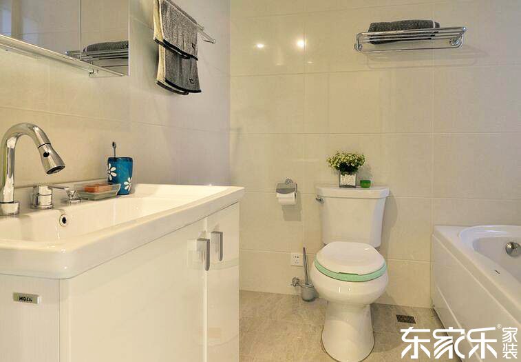 衛生間的裝修比較現代化,白色的墻面、浴室柜及衛浴等顯得空間非常干凈整潔,一小盆綠植的出現讓空間不失清新。